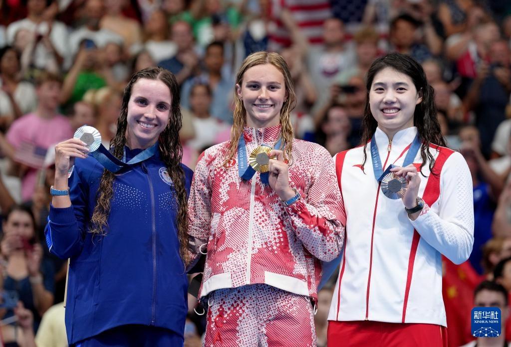 8月1日,冠军加拿大选手麦金托什(中)、亚军美国选手史密斯和季军中国选手张雨霏在颁奖仪式上。新华社记者 杜宇 摄
