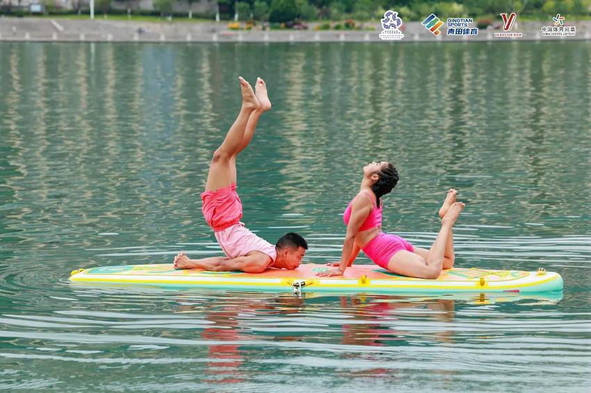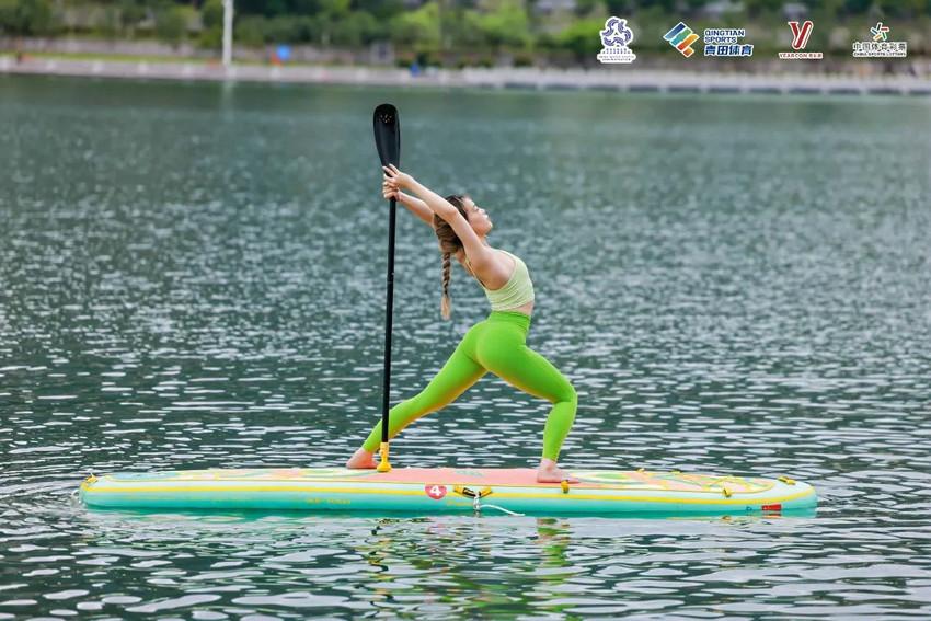 开幕式后,各项赛事拉开帷幕。太鹤湖上,选手们将古老的瑜伽体式与现下正流行的桨板运动融合在一起,在桨板上做出倒立、劈叉、起腿等一个个要求核心力量的瑜伽动作,尽情展示桨板瑜伽的力与美。据悉,此次竞赛项目包括桨板瑜伽、持桨瑜伽、桨板体适能等多项内容,是该项目在全国范围内最高级别的专业比赛。