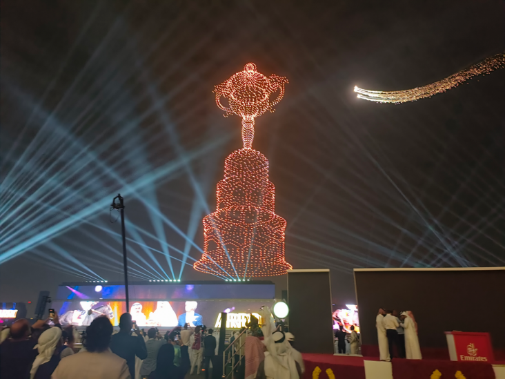 本届迪拜赛马世界杯全部九场赛马结束后,现场举行的闭幕式无人机表演
