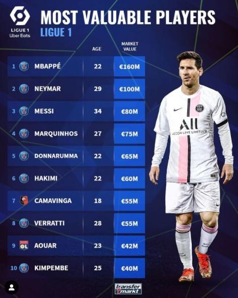 直播吧8月12日讯 在梅西加盟巴黎后,德转官方ins发布了法甲身价前十排名。以下为具体排名: