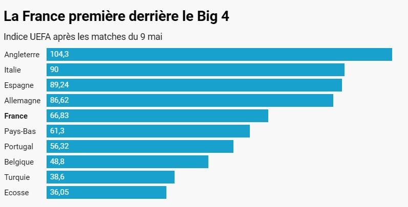 目前法甲俱乐部的欧战总积分为66.831分,排名第五。而排名第四的德甲和勒沃库森与多特蒙德都闯进了欧战决赛,而且双方积分差距过大,排名已经确认无法被法甲反超。至于排名第六的荷甲虽然有61.3分,在赛季初扣除2018-2019赛季的欧战积分后,荷兰曾一度反超法国0.719分,但随着小组赛的开始情况发生了变化,并且在16强结束后荷甲的欧战积分就已经锁定。所以如今法甲的欧战总积分排名已经确定,将排在第5,这会让他们在接下来的两个赛季拥有三个直通欧冠的名额与一个附加赛的名额。