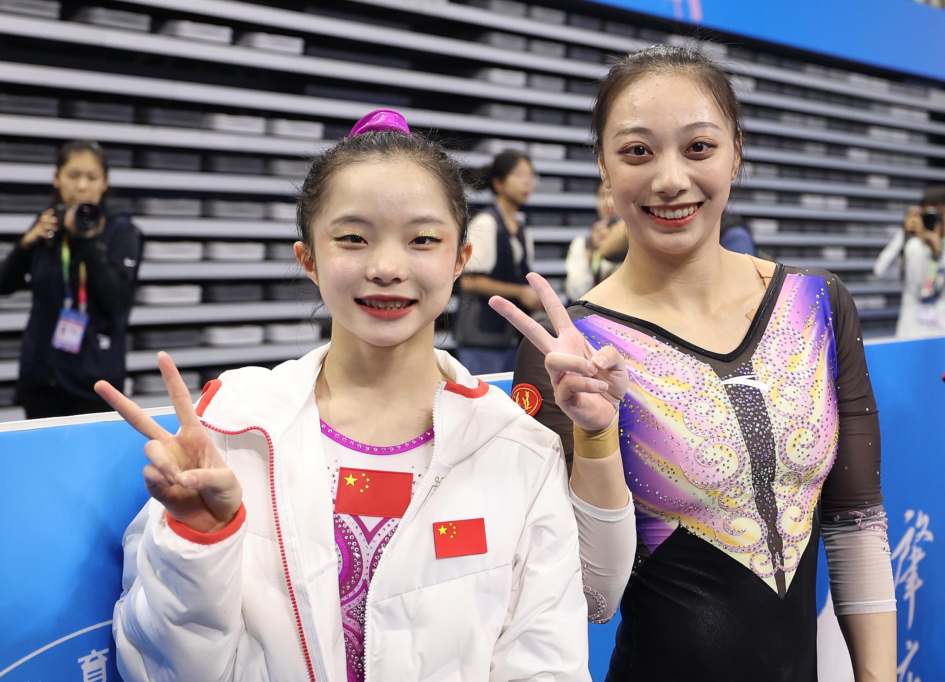 4月28日,河南队选手张怡涵(左)与福建队选手虞琳敏在比赛后合影。 新华社记者曹灿摄