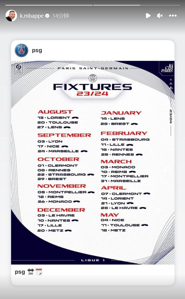 直播吧6月30日讯 拒绝续约的姆巴佩似乎坚持无意今夏离队,他在今日也晒出了巴黎的新赛季法甲日程。