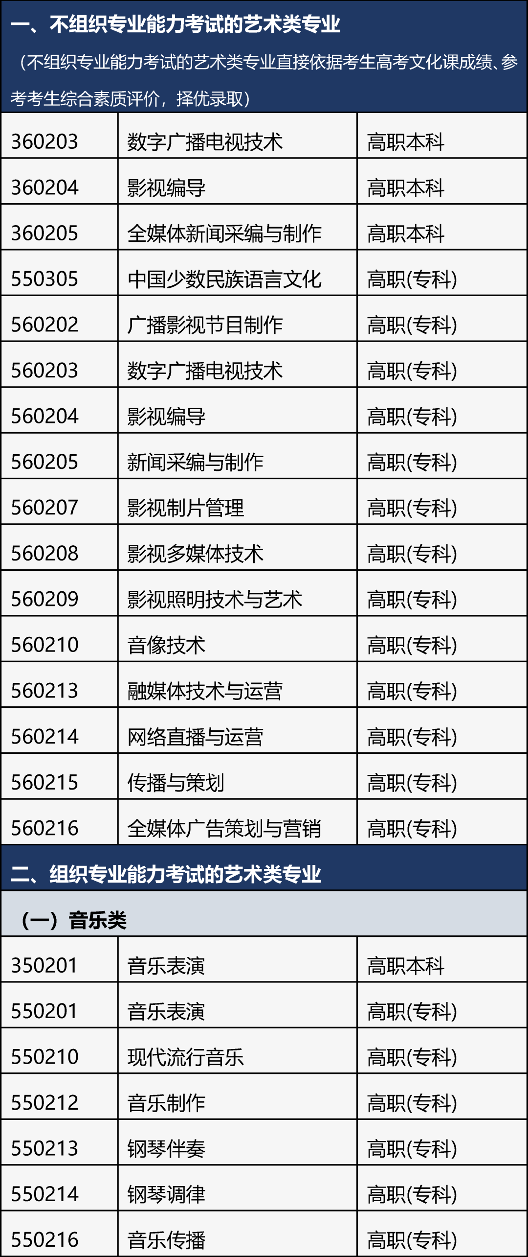 1.教育部《普通高校艺术类考试招生本科专业目录》中艺术史论、艺术管理、非物质文化遗产保护、戏剧学、电影学、戏剧影视文学、广播电视编导、影视技术8个专业和《北京市高等职业教育艺术类考试招生本科和专科专业目录》中数字广播电视技术、影视编导等16个专业,不再进行艺术类专业能力考试,直接依据考生高考文化课成绩,参考考生综合素质评价,择优录取考生。