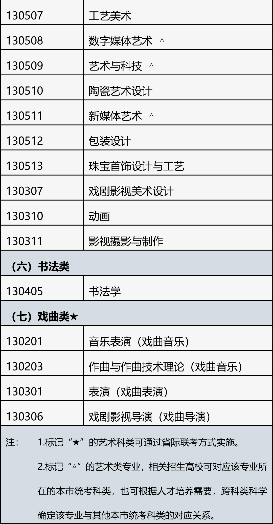 2.7个艺术类考试科类下设的艺术类专业招生实行“文化素质+专业能力”的考试评价方式。招生高校可根据自身办学定位和人才培养实际,对考生专业能力提出艺术科类相对应的专业要求,并使用我市统考成绩、省际联考成绩或高校校考成绩作为专业成绩进行录取。专业目录中标记“★”的科类为戏曲类,可通过省际联考方式实施,标记“△”的艺术类专业,相关招生高校可对应该专业所在的本市统考科类,也可根据人才培养需要,跨科类科学确定该专业与本市统考科类的对应关系。