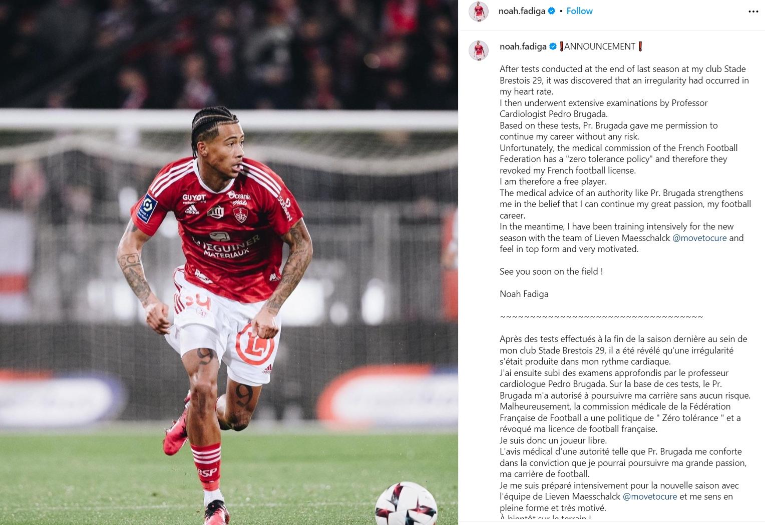 在过去出现过不少问题以后,近年法甲联赛对心脏问题检查的规定逐渐变得更加严厉,有问题必须停止训练和比赛成为重要原则。布雷斯特俱乐部不想冒任何风险,再加上诺亚·法迪加的心脏问题还有家族史,于是,诺亚·法迪加成为自由身,同时他也不能继续在法国联赛踢球,因为联盟根据医生报告吊销了他的竞技参赛许可。