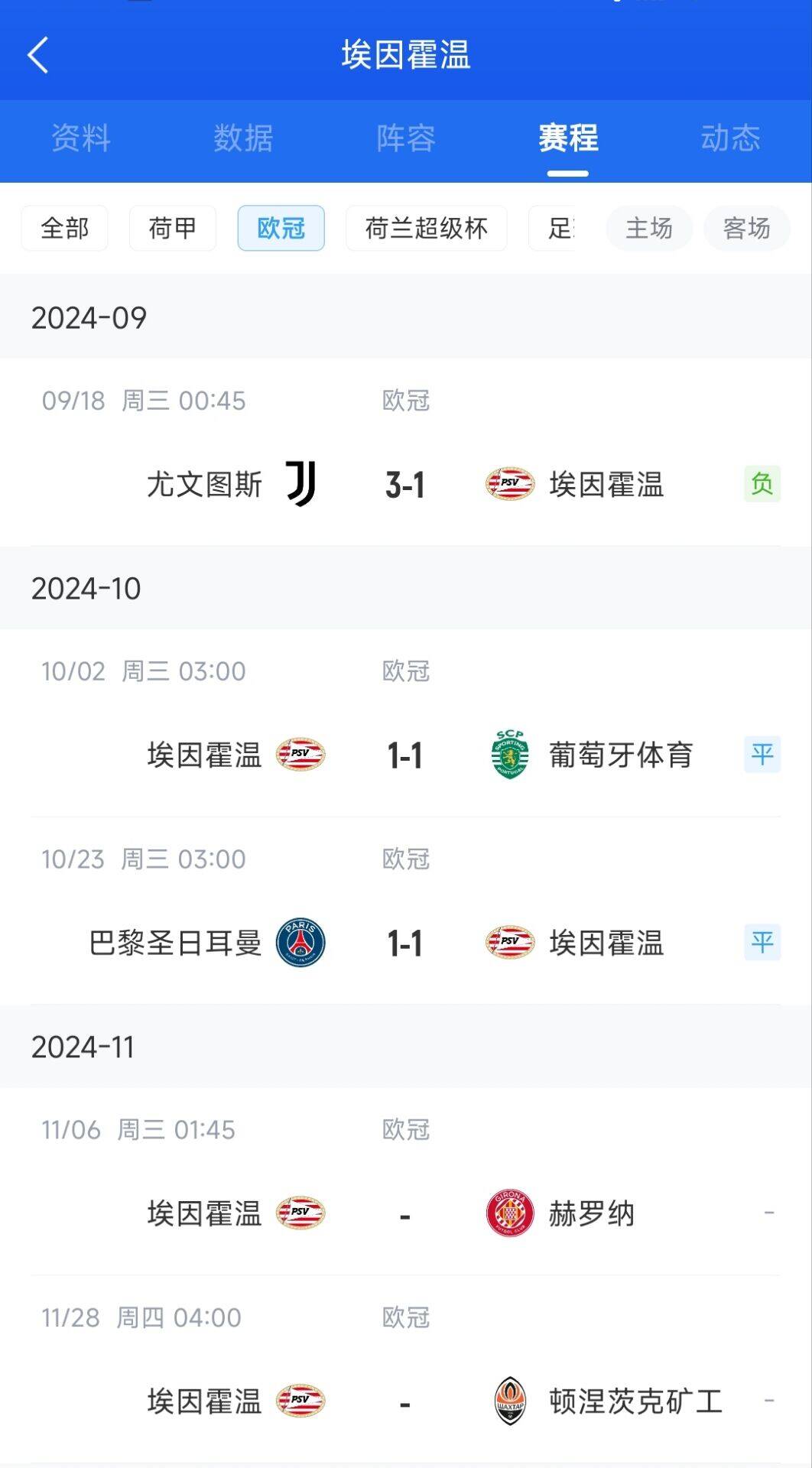 埃因霍温在荷甲9战全胜,目前是荷甲榜首球队,进球数最多&丢球数最少。但是欧战赛场前3轮PSV一胜难求,主要也是因为接连遭遇3支强队。埃因霍温前3轮分别1-3不敌意甲豪门尤文,1-1战平葡超豪门葡萄牙体育和1-1法甲豪门巴黎圣日耳曼。