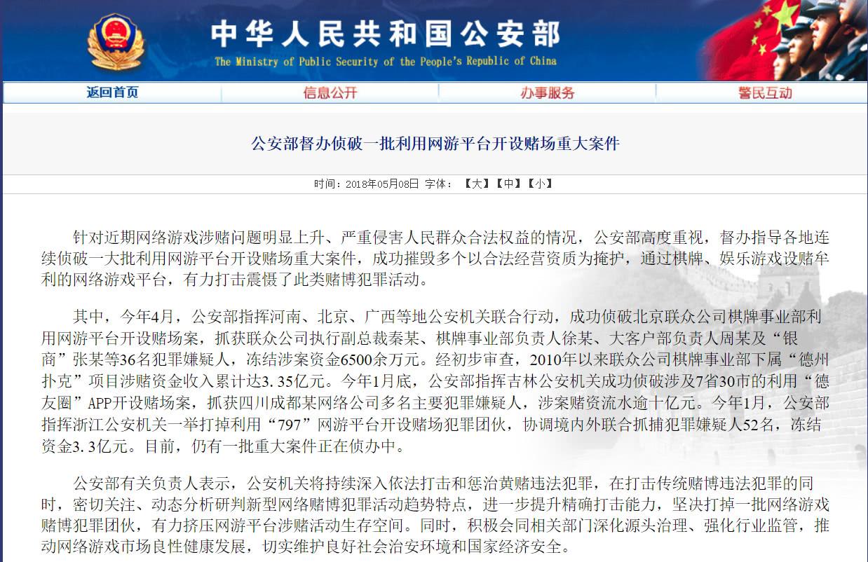 据公安部日前通报,今年4月,公安部指挥河南、北京、广西等地公安机关联合行动,成功侦破北京联众公司棋牌事业部利用网游平台开设赌场案,抓获联众公司执行副总裁秦某、棋牌事业部负责人徐某、大客户部负责人周某及“银商”张某等36名犯罪嫌疑人,冻结涉案资金6500余万元。