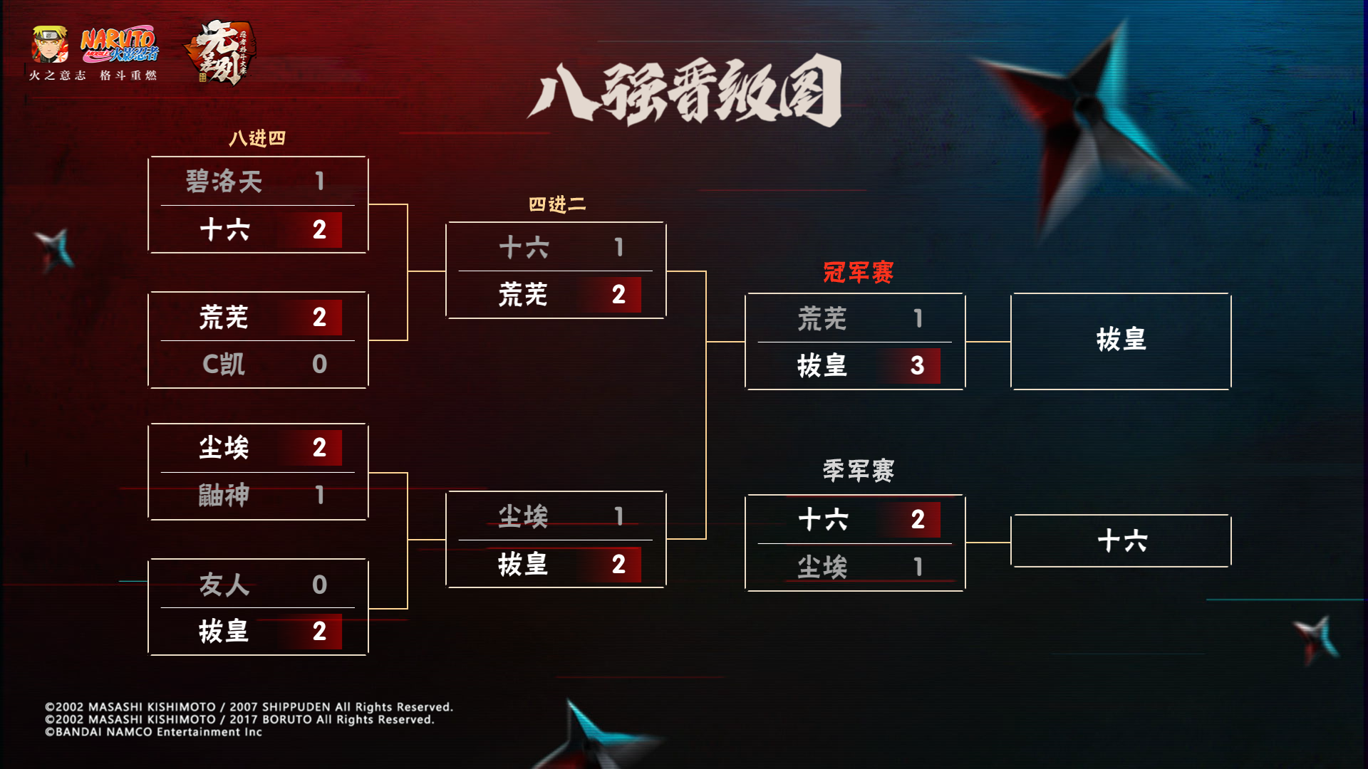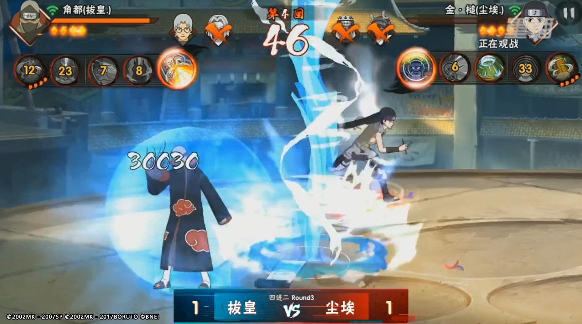 四进二第二场尘埃VS拔皇的对决中,拔皇的“黑虎掏心”放了四次中了三次,可谓是十分精准,之后拔皇更是用春野樱连下尘埃两名忍者,而尘埃最后上场的金槌也被拔皇的春野樱打至血皮。进入了决赛局,在尘埃的金槌全力拖完半分钟之后直接被拔皇抓住机会带走,而拔皇也顺利晋级到最后的冠军赛。