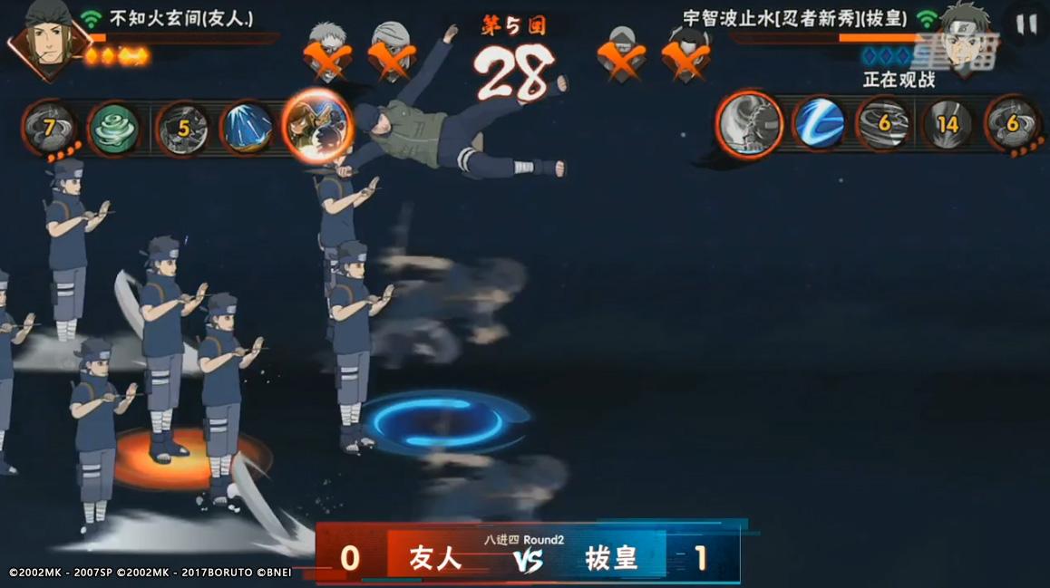 在八进四第四场拔皇VS友人的对战中,开局拔皇就一直有着自己的节奏,而友人这边虽然也打出了一些细节操作,像是黑土的喷水以及减速都应用的十分到位,但全程仍然被拔皇带着节奏走。在最后,友人则是以三分之二血量的不知火玄间迎战拔皇的宇智波止水。起手友人凭借飘逸的走位抓住机会将宇智波止水打至半血,本以为还有机会晋级,但友人在没有秘卷的情况下,被反手的拔皇抓住机会直接开启大招带走,痛失好局。