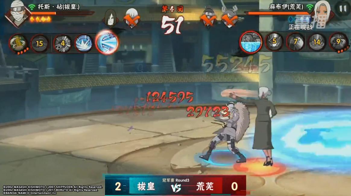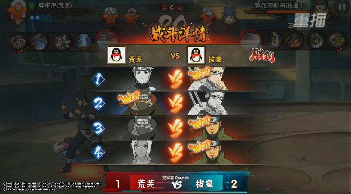 在最终的BO4决赛局当中,两位选手都顶着非常大的压力开启了第一小局的比赛。拔皇的长十郎先手抓到荒芜的希,在伤害爆表的技能下荒芜直接被打掉了半血,此时拔皇用了同样的操作将荒芜逼至墙角一波带走。在第二小局当中荒芜的角都在拔皇转身之际,抓住机会一波连招带走,此时的双方状况胶着,但是在第四小局当中拔皇的猿飞阿斯玛直接在麻布伊抓人之际闪身走位,反手直接开大将麻布伊打至血皮,最后凭借阿斯玛的一双“小粉拳”直接将拔皇送上了本届的冠军之位。