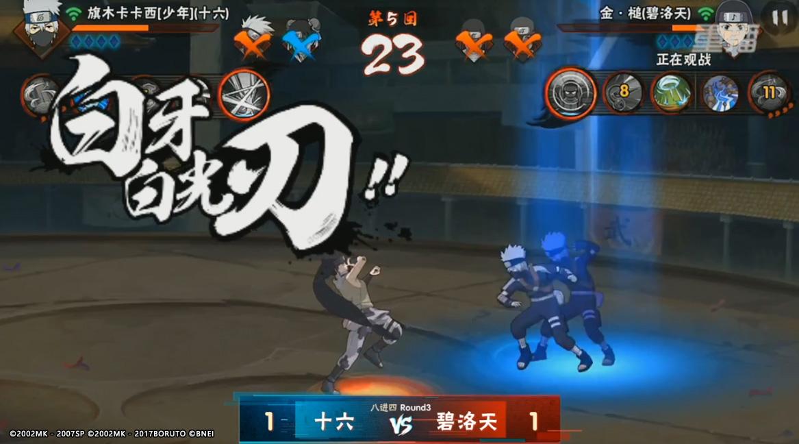 八进四第一场碧洛天VS十六的比赛中,选手十六与碧洛天二人可能因为首发第一场的关系,心态略有不稳,双方在对战当中都有一些小失误。在最后的决胜局中,十六先后用出卡卡西和天天两位忍者才磨掉了碧洛天的神月出云,本以为翻盘无望,但十六的少年卡卡西凭借细节走位和操作连下两城,特别是最后对战碧洛天的金槌时,开场抓到人之后直接开大,再接一套连招将金槌打至血皮,第二大招开启,十六凭借少年卡卡西锁定胜局,以2:1的比分成功晋级。
