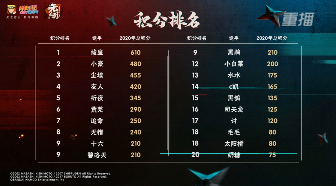 这次决赛结束之后,无差别赛事选手的积分排名也发生了变化,因为这是《火影忍者》手游2020年赛事升级后的首个无差别决赛,所以拔皇因积分系数的叠加直接上升到了排行榜第一,而十六这次复出因为没有积分基础只能屈居第九,2019年无差别年度总决赛冠军小豪则因为无缘本次比赛,所以积分没有变动,积分第一的宝座随之让位本次比赛的冠军拔皇。