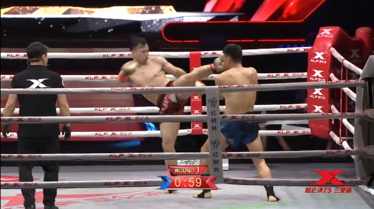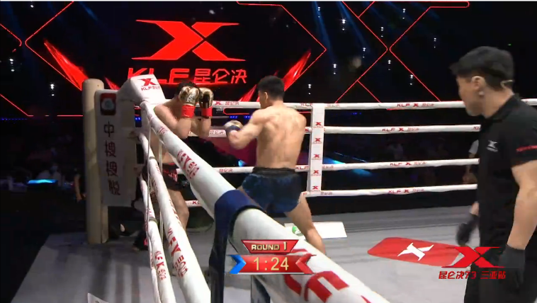 比赛开始后,刘海南不顾冯兴礼的赫赫威名,以初生牛犊不怕虎的攻势,势如破竹的对冯兴礼展开了猛烈的进攻。而素来以稳健打法著称的冯兴礼,在上场还未适应比赛节奏,被刘海南突如其来的猛烈进攻给打乱了节奏,并且被刘海南的重击击倒在擂台上,遭遇了第一次读秒。在站起来后,身为军人的坚毅让冯兴礼没有选择放弃,而是继续死磕对手,展开反击。但是由于刚刚遭受到重击,身体还未能恢复过来,刘海南抓住这个机会,再次击倒冯兴礼,迎来了对手的第二次场上强读。