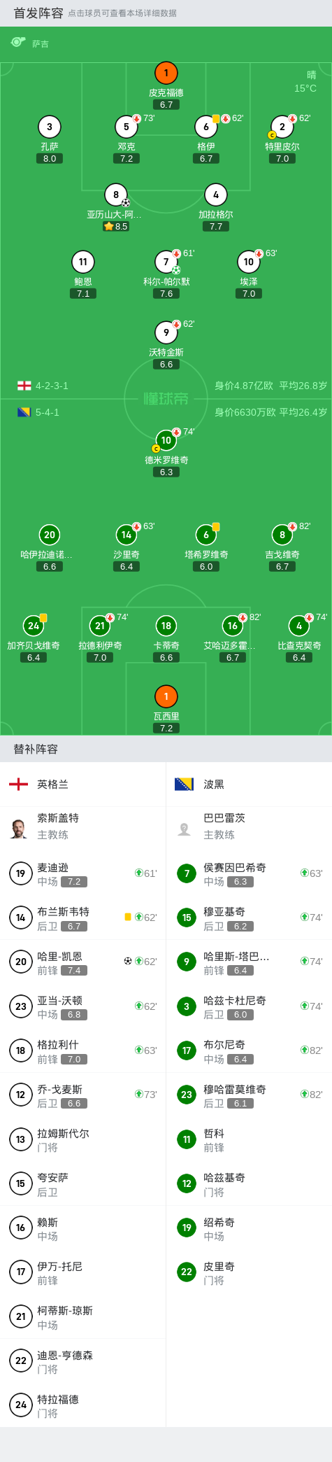 英格兰替补:13-拉姆斯代尔、22-迪恩-亨德森、24-特拉福德、12-乔-戈麦斯、14-布兰斯维特、15-宽萨、16-赖斯、17-伊万-托尼、18-格拉利什、19-麦迪逊、20-凯恩、21-柯蒂斯-琼斯、23-亚当-沃顿