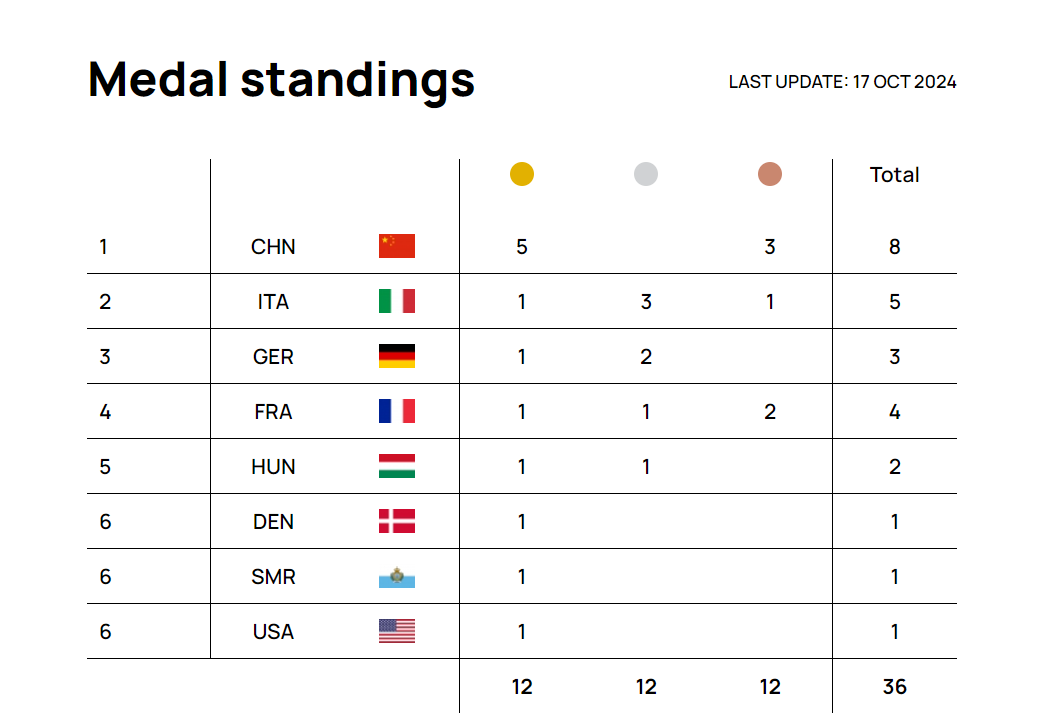 北京时间10月17日,2024年射击世界杯总决赛全部比赛结束。中国队以5金3铜共8枚奖牌的成绩领跑金牌榜和奖牌榜。