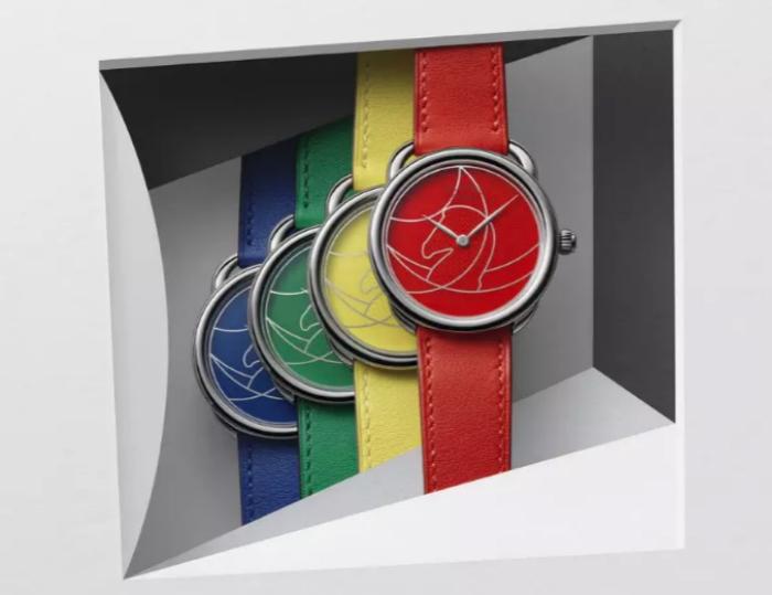 爱马仕也有从马与马术发想的腕表。比方Arceau系列,圆形表壳上下两端两个具有弧度的不对称拱形表耳,设计灵感便是来自马镫造型。今年最新推出的Arceau Casaque腕表,灵感则是来自“旋转木马”的欢乐时光。