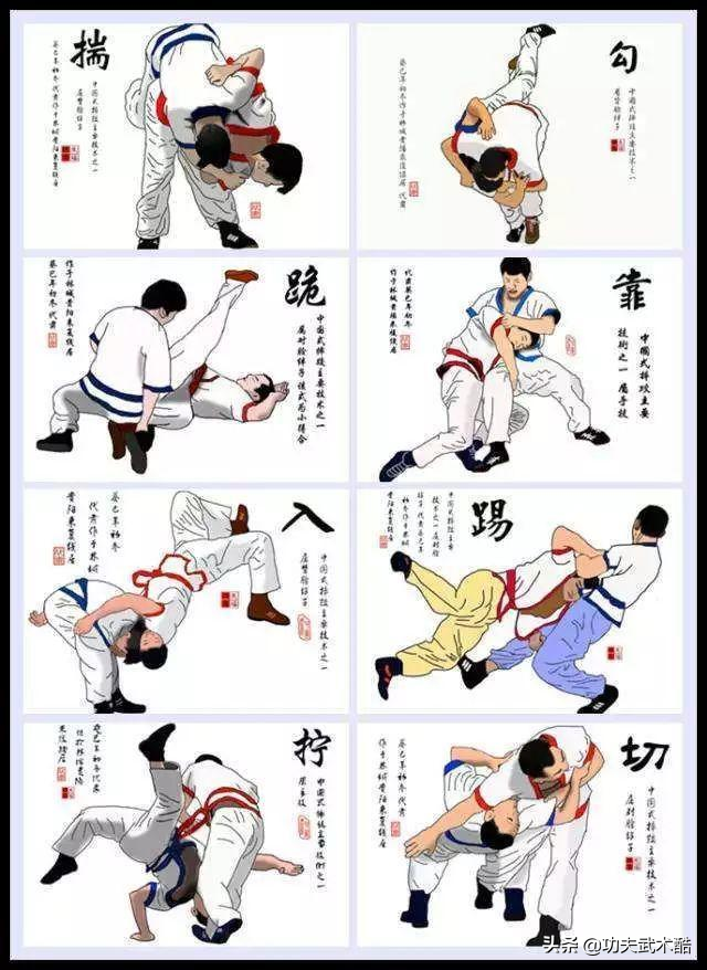 中国摔跤技术、招式丰富多彩,经常使用的方法有背、别、挑、缠、揣、踢、拧、搂、弹、搿、抱腿、跪腿、里勾腿、插闪、勾脚、里刀勾等。