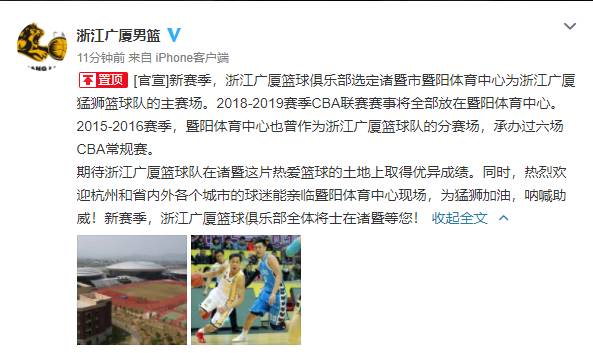 直播吧8月10日讯 今日浙江广厦官宣新赛季主场选定为诸暨市暨阳体育中心。