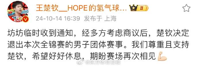 10月14日,据@王楚钦__HOPE的氢气球工坊 的消息:经多方考虑商议后,王楚钦决定退出本次全锦赛的男子团体赛事。