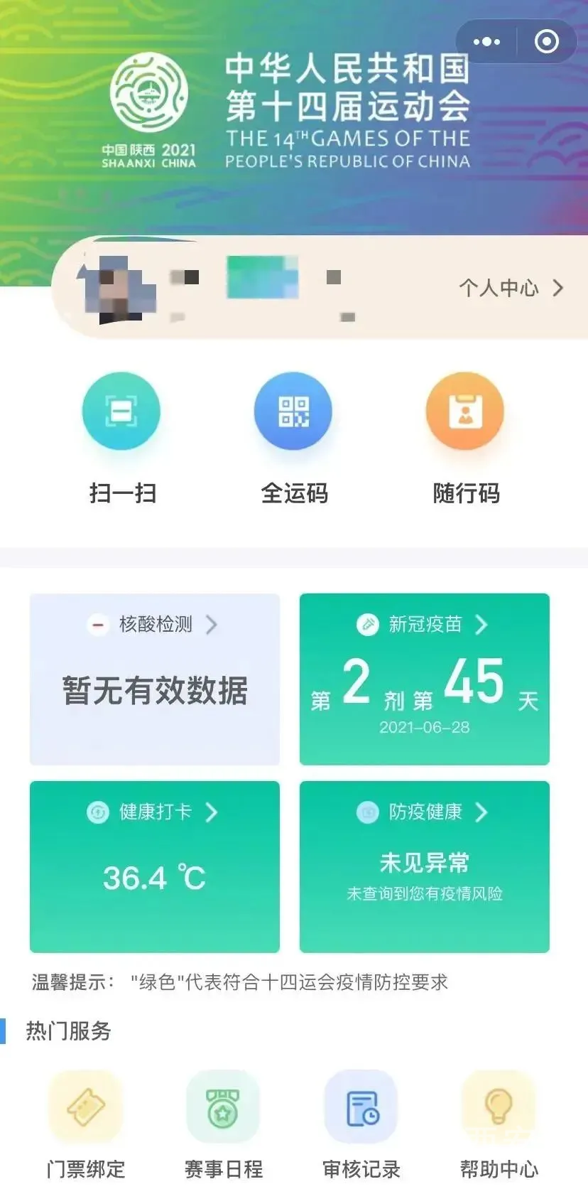 所有的涉赛、观赛人员,在抵陕或开赛前14天完成系统实名注册后,每天应登录小程序页面,在“健康打卡”处进行个人体温监测、健康打卡,连续的健康打卡才能保证个人疫情信息的正常。