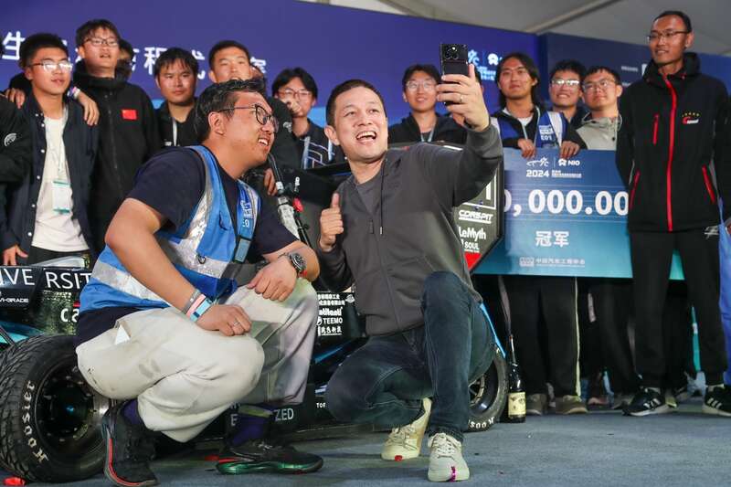中国大学生方程式系列赛事创立于2010年,由中国汽车工程学会与李斌联合发起,至今已累计为中国汽车行业输送人才6万多名,被誉为“中国汽车工业人才的摇篮之一”。图为蔚来创始人、董事长兼CEO李斌与冠军车队代表合影。主办方供图