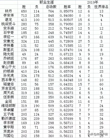 (林丹现役选手胜率最高,统计来源于网络)