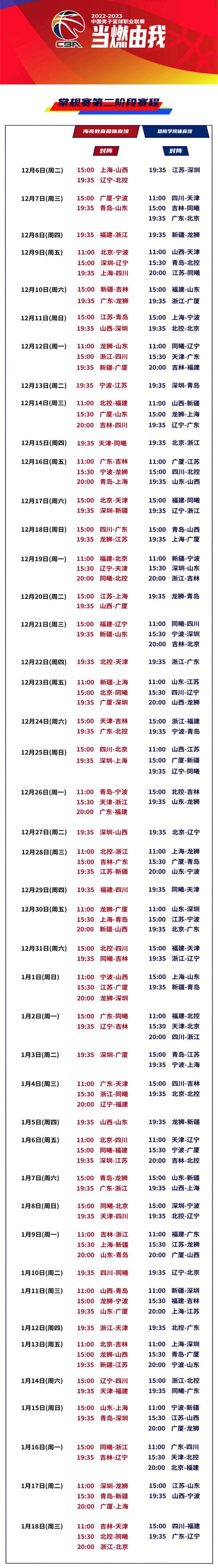 新华社北京11月19日电 中国男子篮球职业联赛(CBA)19日公布了2022-2023赛季常规赛第二阶段赛程。CBA常规赛第二阶段比赛仍将采用赛会制形式,于12月6日起在浙江省诸暨市举行。