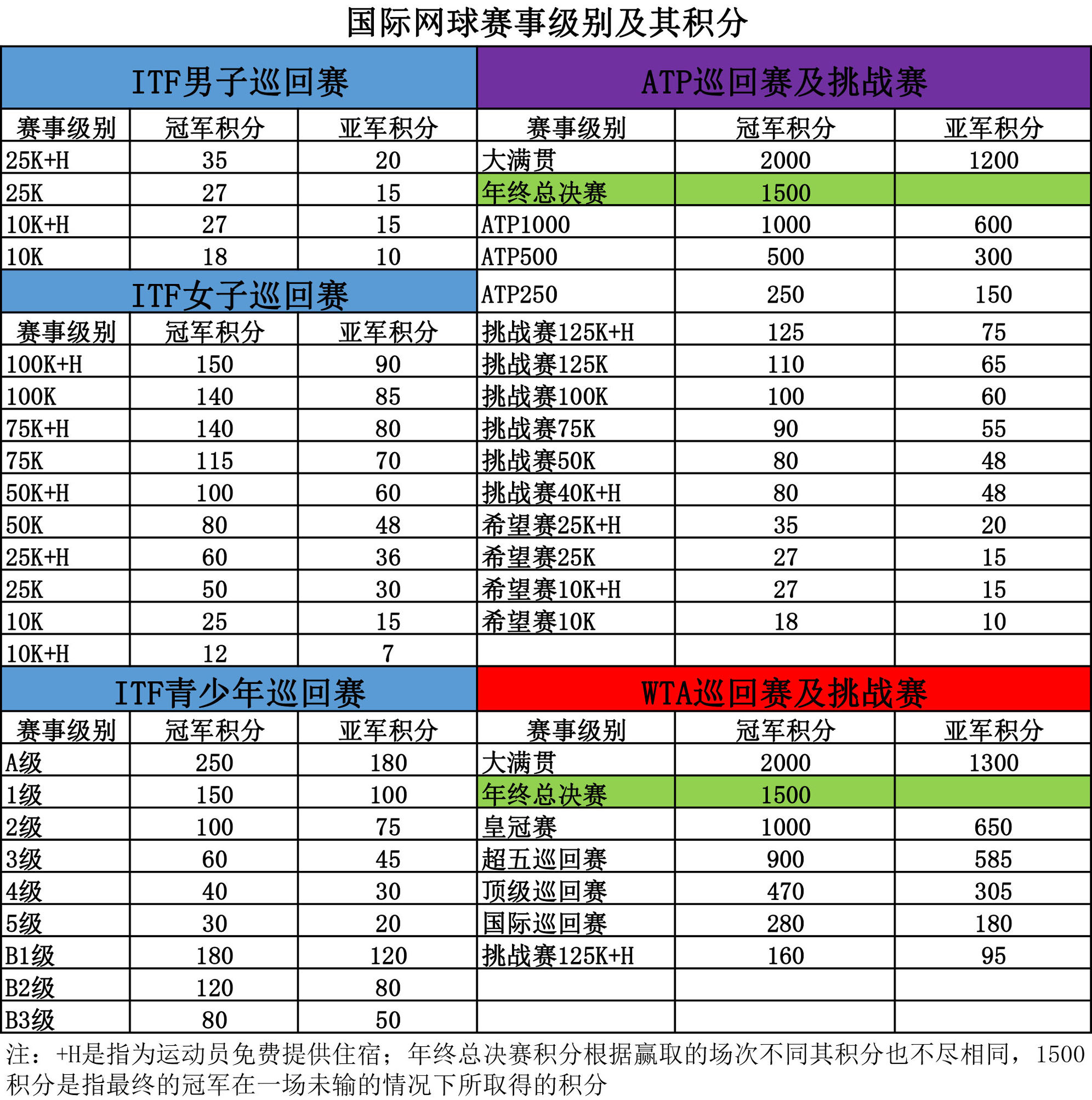 国际网球赛事级别、积分一览表: