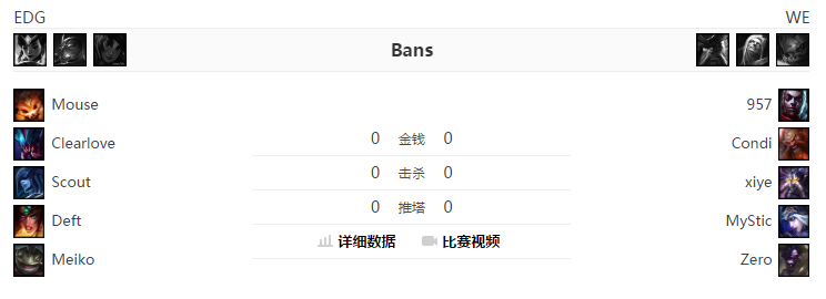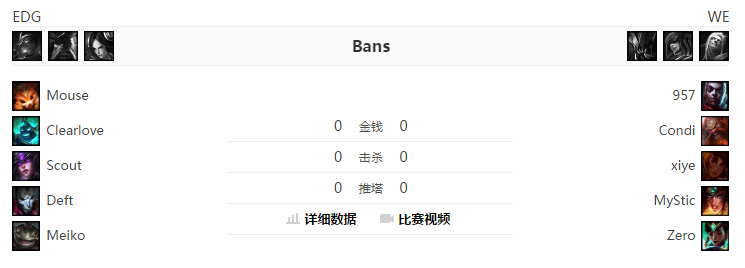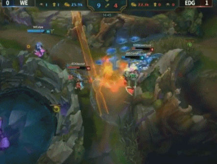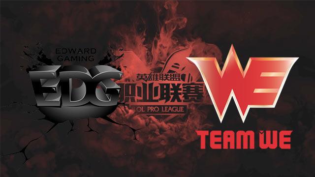 双方前期激烈火拼,WE中野下路在4分钟就交出3个闪现。5分钟WE下路压线过前,5级Scout直接传送配合下野拿下对手双人路人头。7分钟厂长配合丽桑卓中路再杀卡萨丁,EDG八分钟获得2k领先。14分钟双方在WE蓝Buff处纠结许久,957支援赶到后让WE打出一波小反扑,然而Mouse上路无脑单带拿下外塔一血,EDG经济领先3k。随后双方上下路选择换塔,然而EDG推进速度明显领先,一路通关带上高地,17分钟击破WE下路水晶。23分钟WE失去耐心在红区强开Meiko,然而Scout侧翼入场控制秒杀Mystic寒冰,EDG接团打出1换2后rush大龙,在龙坑外击杀唯一惩戒威胁的Condi后轻松拿下。26分钟厂长下路直接带掉水晶,WE选择绝望开团但雷克赛抗住伤害,EDG反打让WE毫无还手之力几乎遭到团灭,一波结束比赛,1-0领先!