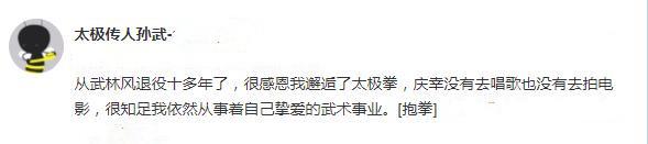孙武说:“从武林风退役十多年了,很感恩我邂逅了太极拳,庆幸没有去唱歌也没有去拍电影,很知足我依然从事着自己挚爱的武术事业 。”孙武的话不多,但是足以说明了问题。他“庆幸”这个词用得很有深意啊,什么叫庆幸?指为意外地得到好的结局而高兴,是一种侥幸的心理。可见自己对拜陈小旺大师为师感到庆幸,选对了路。没有去演电影也没有去唱歌,坚持热爱武术,热爱太极,让自己现在过着很满意的生活。那么谁在唱歌谁在拍电影?