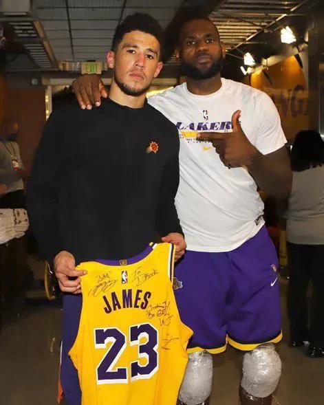 詹姆斯将自己的比赛球衣赠与布克,并为之签名留言“继续成就杰出”鼓励对方。詹姆斯拥抱布克,双方合影留念。