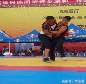 彝族式摔跤擂台赛是力量、技术和美的体现,已成为西昌火把节的一项传统体育赛事,深受彝族摔跤好手和广大游客的喜爱。