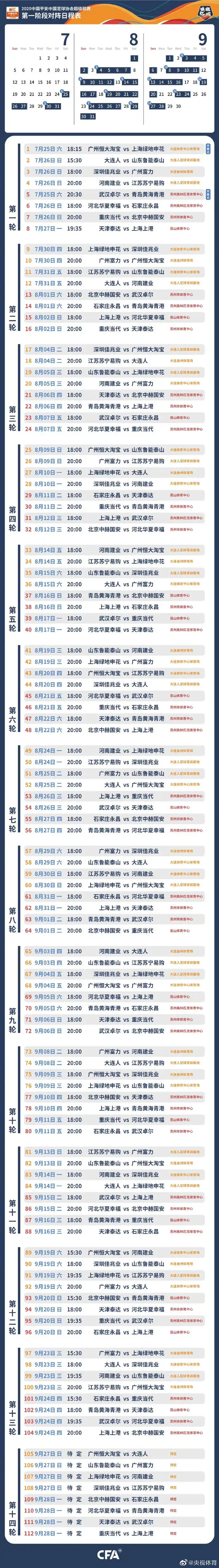 昨天,中国足球协会超级联赛第一阶段赛程正式公布。7月25日至9月28日,16支中超俱乐部将在大连、苏州两大赛区联袂上演14轮共112场精彩对决。7月25日,广州恒大将对阵上海申花,打响新赛季中超揭幕战。26日,河北华夏幸福对阵石家庄永昌,上演河北德比。