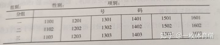 分组时如无报名成绩,且人数较多,可采用斜线分组法,将参赛运动员的卡片或号码按单位依次上下排列,然后用斜线通过卡片或号码分组。如下图,初一男子100米预赛18人,按成绩取前6名参加决赛,跑道6道,分3组。