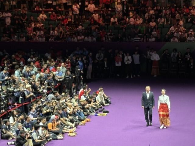 5月5日,四川成都,汤姆斯杯颁奖仪式上,身穿中国传统服饰的引导员引导一位颁奖嘉宾上台颁奖。中青报·中青网记者 王鑫昕/摄