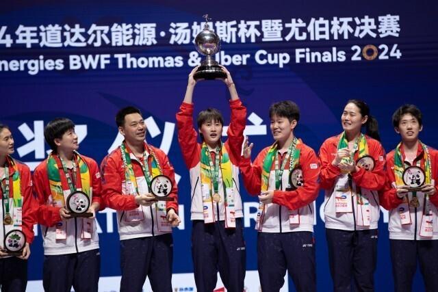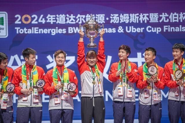 5月5日,四川成都,汤姆斯杯颁奖仪式上,中国队第11次捧起汤姆斯杯。汪龙华/摄