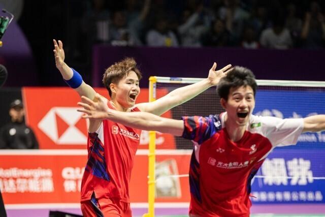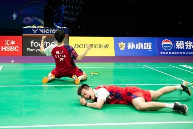 5月5日,四川成都,汤姆斯杯决赛现场,中国队的何济霆/任翔宇组合庆祝赢得了捧杯的最后一分。汪龙华/摄