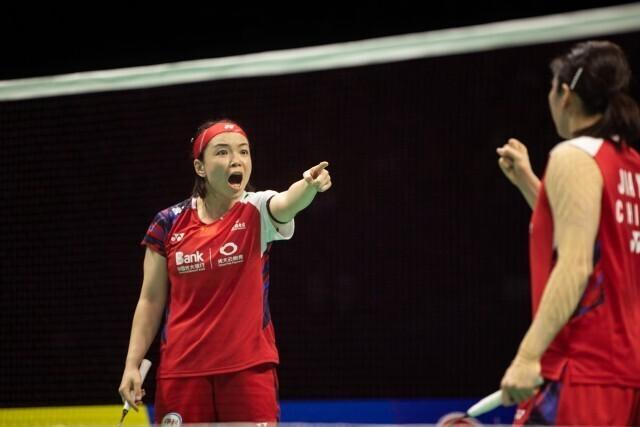 5月5日,四川成都,尤伯杯决赛现场,在第二场女双比赛中,中国队的陈清晨得分后与队友贾一凡大吼庆祝。中国队的陈清晨/贾一凡组合,以21:11和21:8战胜印尼队的西蒂/苏吉亚托组合。汪龙华/摄