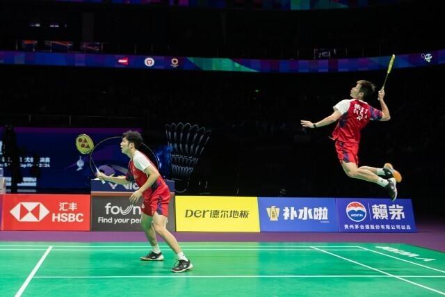 5月5日,四川成都,汤姆斯杯决赛现场,在第二场男双比赛中,中国队的梁伟铿/王昶组合迎战印尼队的阿尔菲安/阿迪安托组合。“梁王组合”在决胜局末段利用发球优势反超比分,为中国队赢下关键的第二分。汪龙华/摄