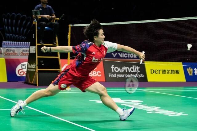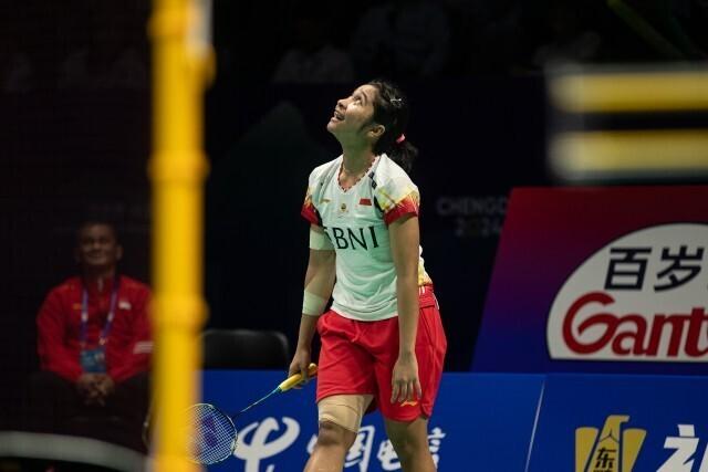 5月5日,四川成都,尤伯杯决赛现场,印尼队的瓦多约在第三场女单比赛中。瓦多约在拿下首局后被中国队的何冰娇逆转。汪龙华/摄