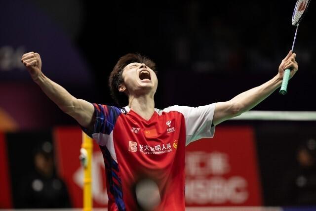 5月5日,四川成都,汤姆斯杯决赛现场,石宇奇为中国队获得第一分后,仰天长啸庆祝。汪龙华/摄