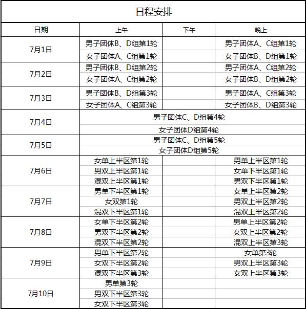 本次赛事共设定七个项目:男子团体、女子团体、男子单打、女子单打、男子双打、女子双打、混合双打。