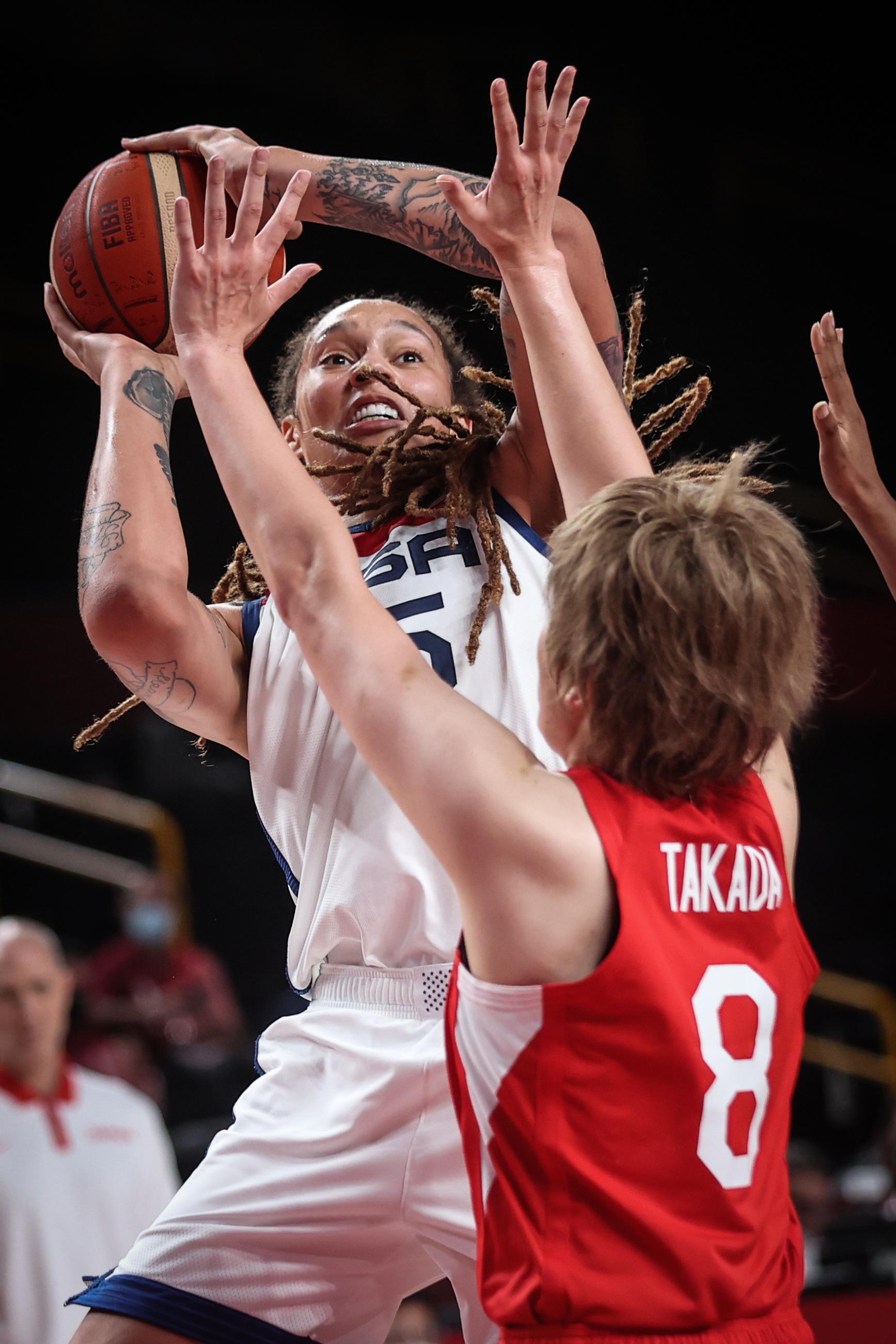 8月8日,美国队球员格里纳 (右)在比赛中。 新华社记者 潘昱龙 摄