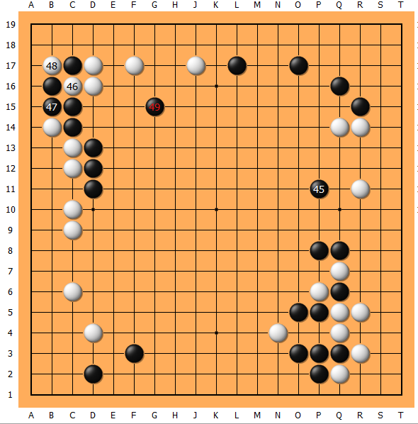 45抢先在右边出击!此时的小黄略显惊讶,46、48不慌不忙,49是我纠结再三的补棋方法,为了以后上方还存有靠、断的后续手段。