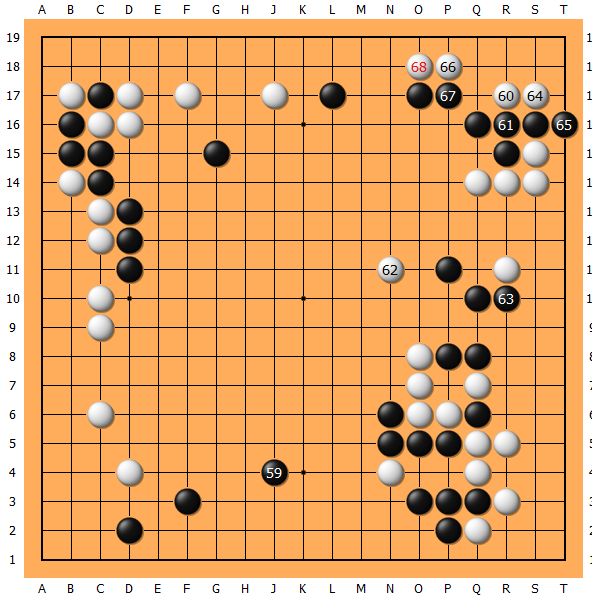 于是实战我只好任白棋又上施展手段,白62与黑棋的交换个人认为可以考虑保留。68时火药味越来越浓。