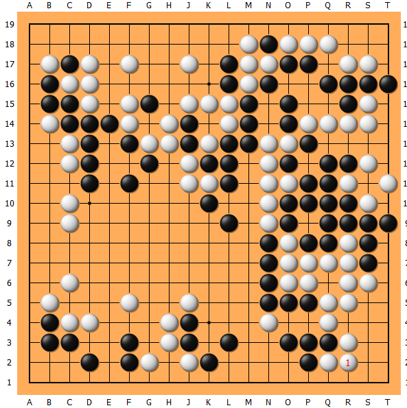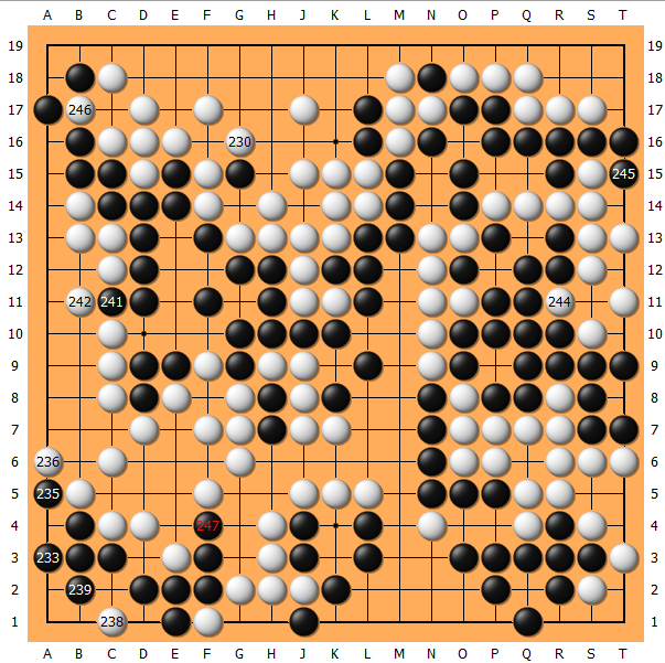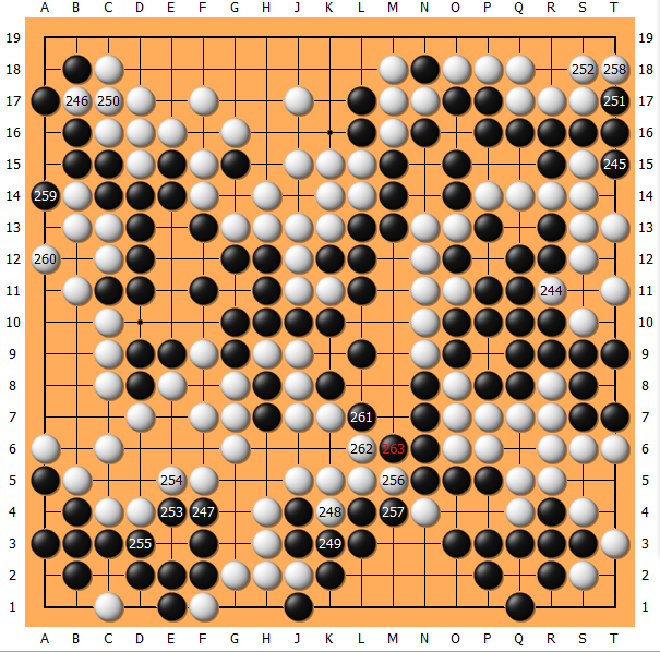 左上角最终白打赢了劫,但是黑棋251、253、255也都很大,最终以3点(相当于2目半)之优惊险获胜。