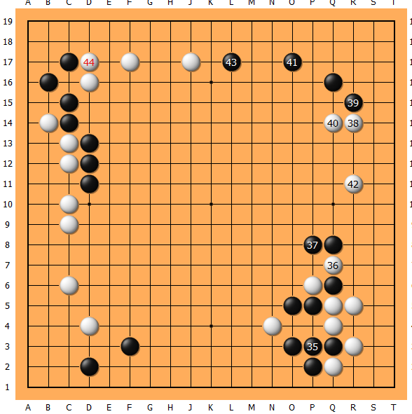 布局对弈至44,我迎来了本局第一个沉思。