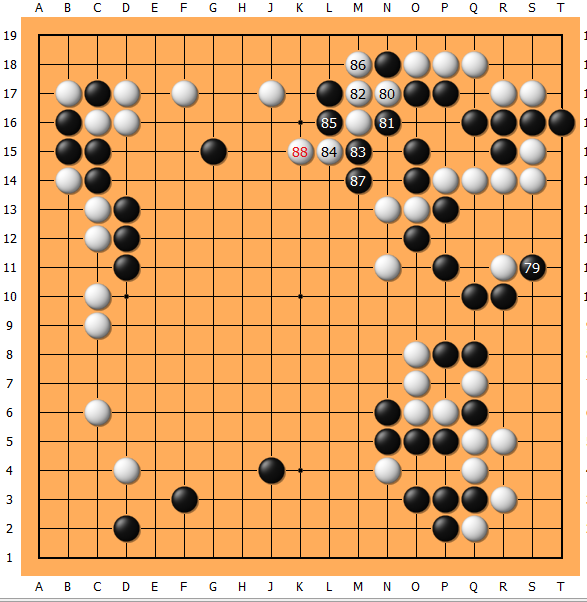 79只能气合了,88转换后形势不明。当时我个人觉得右边吃掉后不仅目数多,而且整体也变厚了。