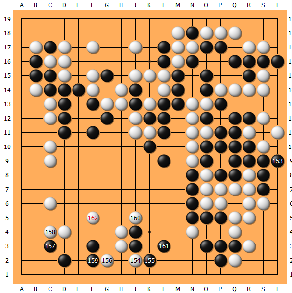 154/156最大限度破空的同时还牵连黑左下,下至162开始官子战的争夺。